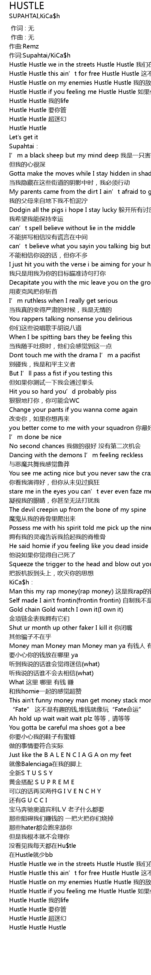 | [02:23.958] | Hustle Hustle we in the streets Hustle Hustle 我们在街上 |