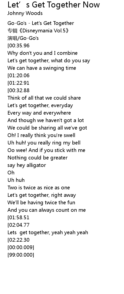 | [00:12.46][00:35.96][01:41.15] | Let's get together, yeah yeah yeah |