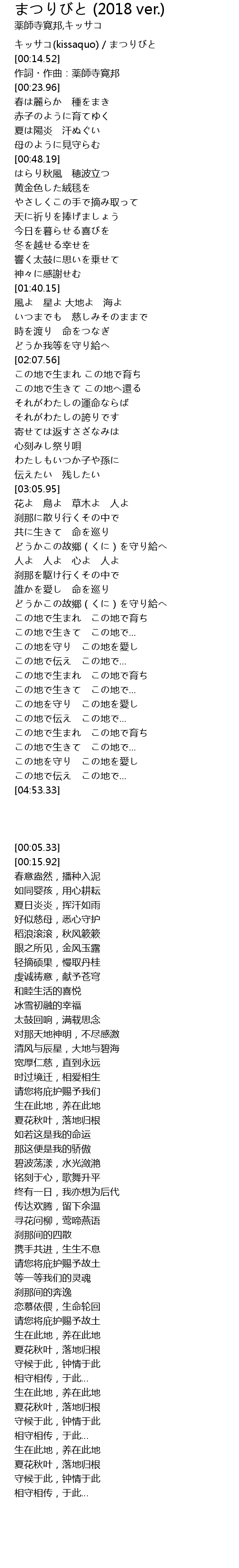 | [00:05.33] | キッサコ(kissaquo) / まつりびと |