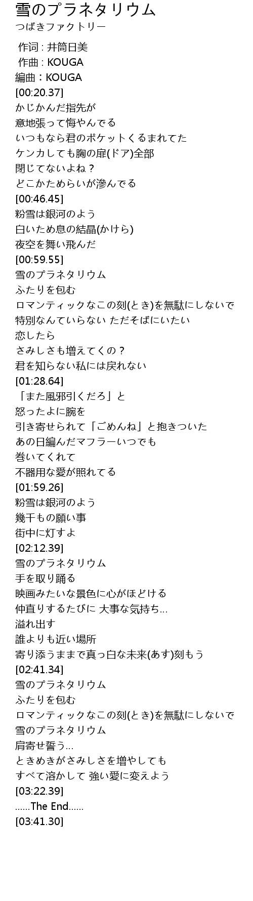 | [00:53.24] | 白いため息の結晶(かけら) |
