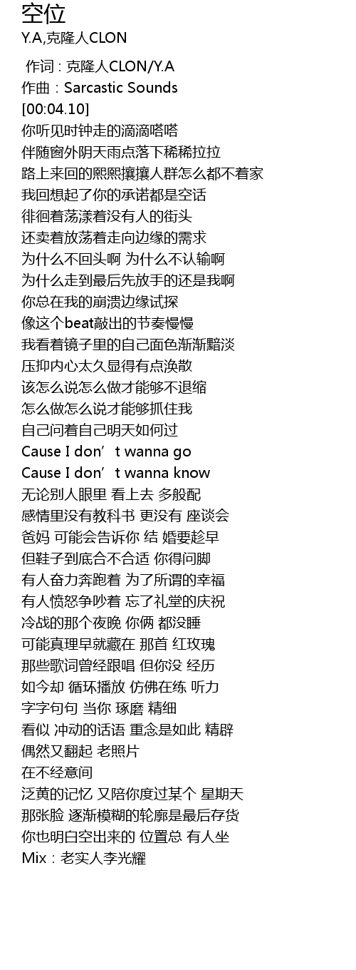 | [00:01.000] | 作词 : 克隆人CLON/Y.A |