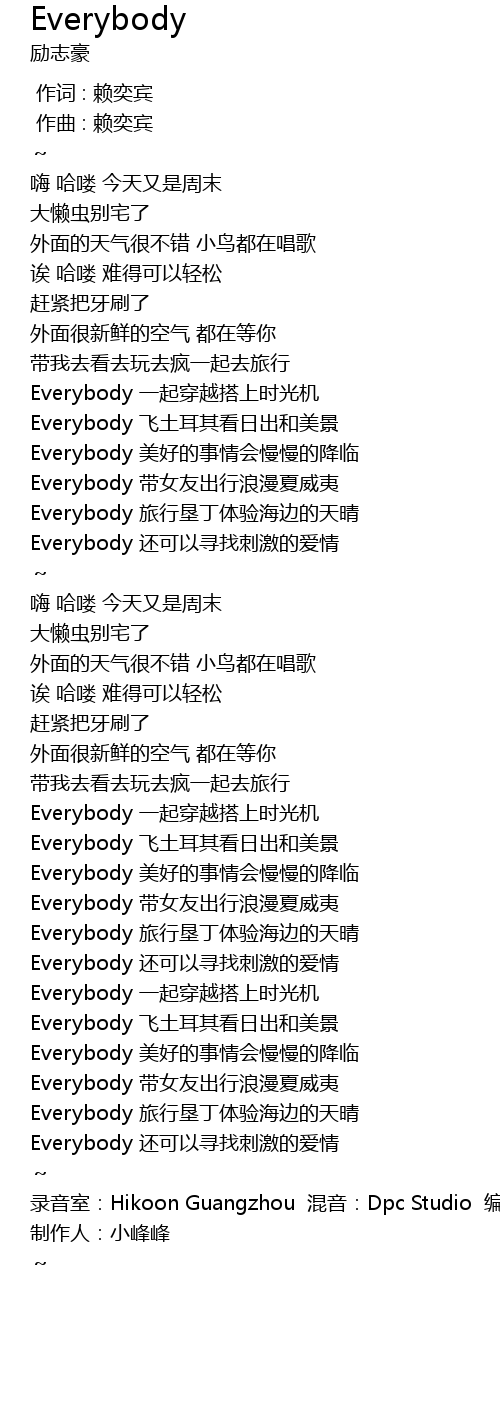 | [02:57.0] | 录音室:Hikoon Guangzhou 混音:Dpc Studio 编曲:吕宏斌 制作人:小峰峰 |