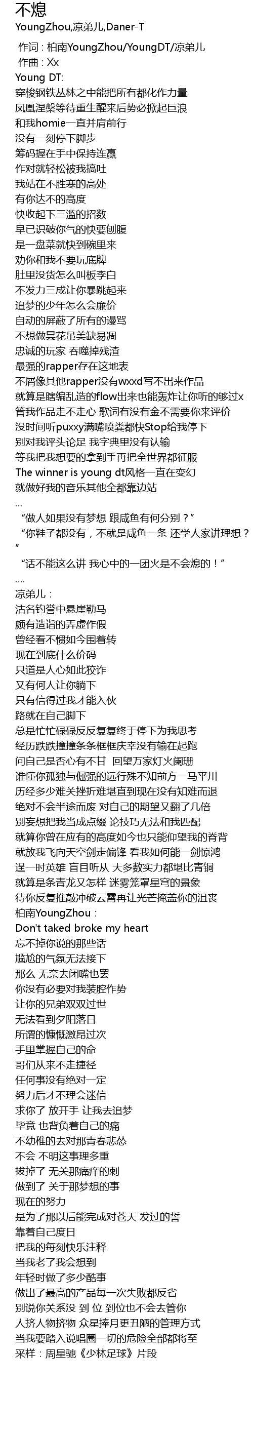 | [00:01.000] | 作词 : 柏南YoungZhou/YoungDT/凉弟儿 |