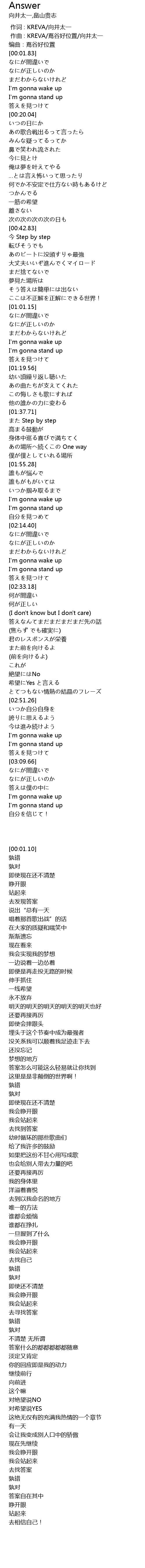 | [00:01.010] | 作曲 : KREVA/蔦谷好位置/向井太一 |
