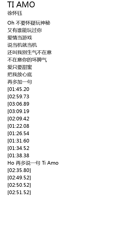 | [02:52.52][01:45.20][00:50.43] | Ti Amo,Oh Ya~I love you |