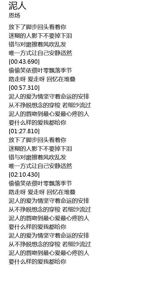 | [02:55.290] | 泥人的爱为情坚守着命运的安排 |