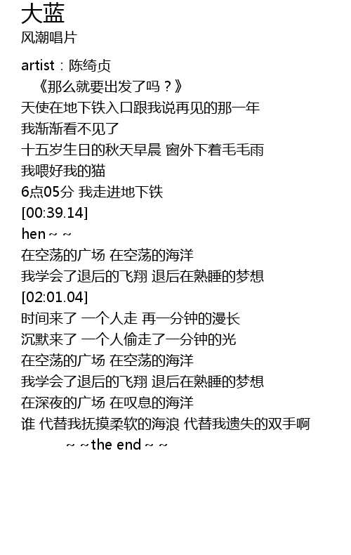 | [01:39.81] | zai kong dang de guang chang zai kong dang de hai yang |