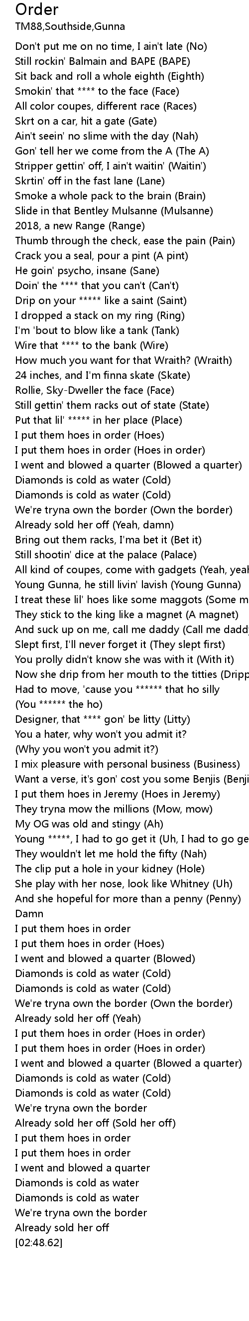 | [02:24.49] | I put them hoes in order (Hoes in order) |
