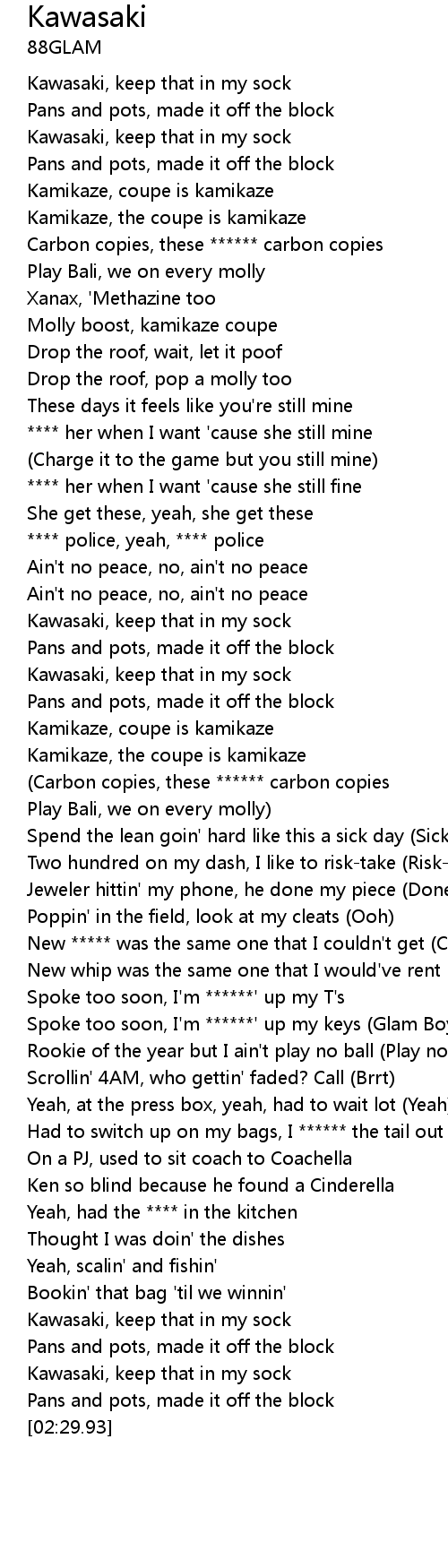 | [02:23.33] | Kawasaki, keep that in my sock |