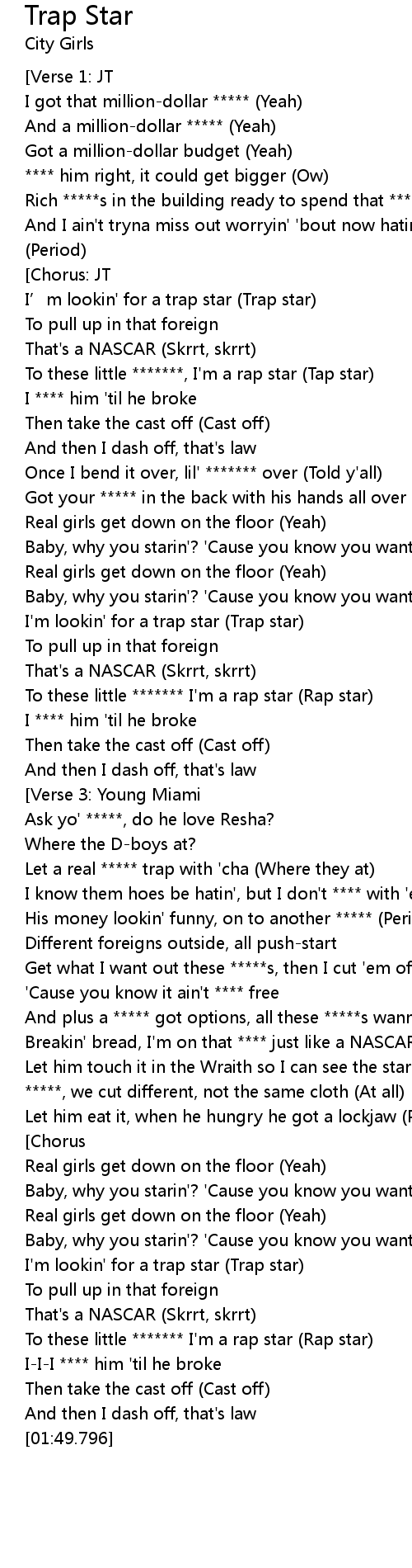 | [01:38.077] | I'm lookin' for a trap star (Trap star) |