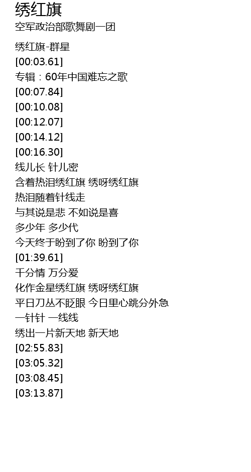 | [00:48.21] | 含着热泪绣红旗 绣呀绣红旗 |