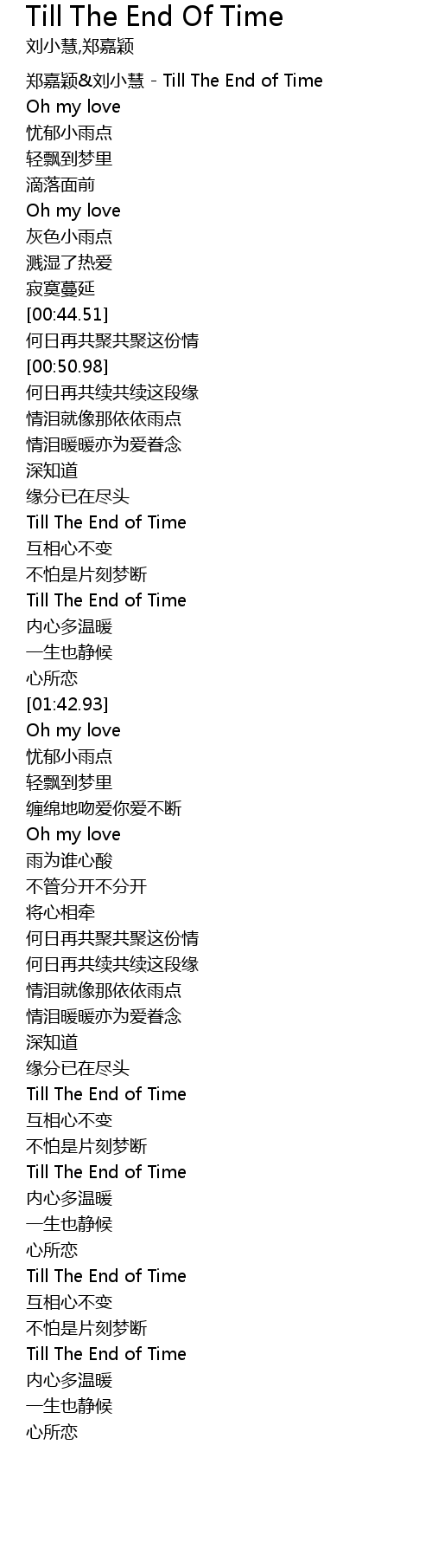 | [00:01.22] | 郑嘉颖&刘小慧 - Till The End of Time |