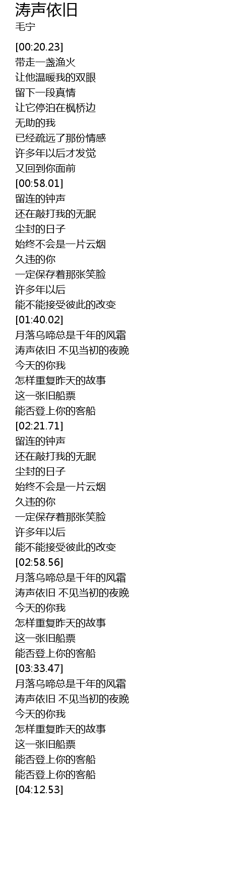 | [01:49.39] | 涛声依旧 不见当初的夜晚 |