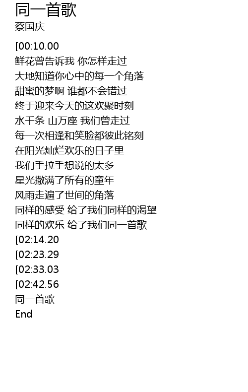 | [04:00.44][02:42.56] | 同样的欢乐 给了我们同一首歌 |