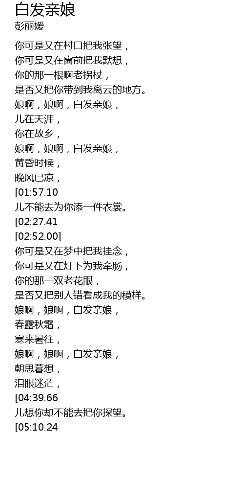 | [02:38.22][02:27.41] | 娘啊,娘啊,白发亲娘。 |