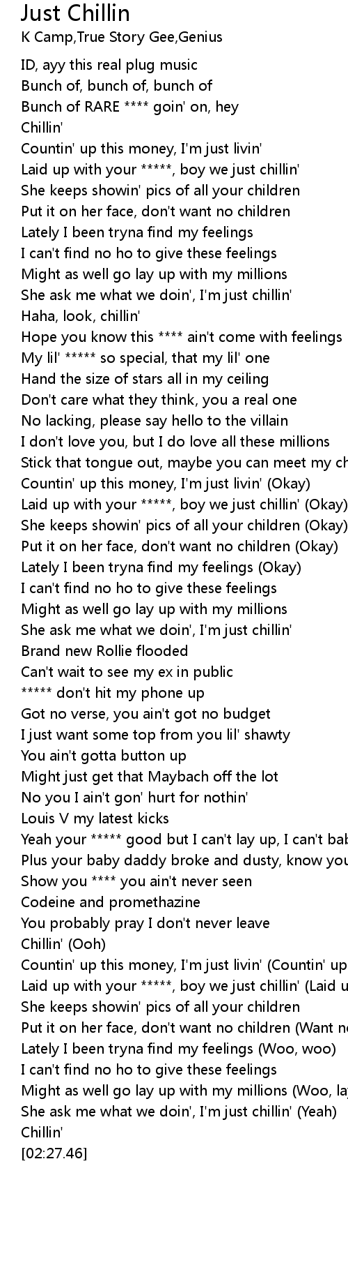 Laid up with your *****, boy we just chillin' |