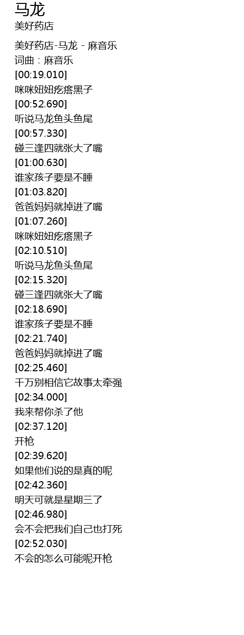 | [00:02.030] | 美好药店-马龙 - 麻音乐 |