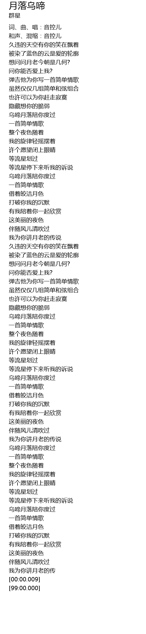 | [00:02.26] | 词、曲、唱:音控儿 |