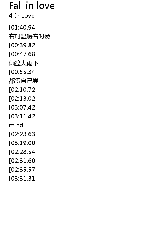 | [03:43.26][03:31.31][02:39.55][01:31.87][00:24.18] | Every body fall in |