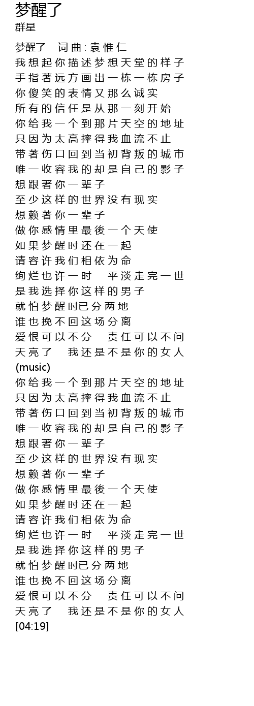 | [00:00] | 梦醒了 词 曲 : 袁 惟 仁 |
