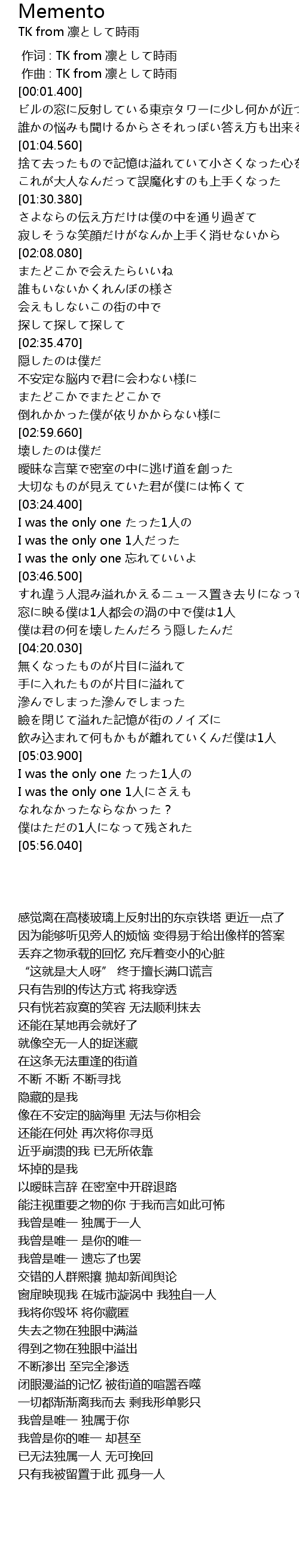 | [03:38.400] | 我曾是唯一 遗忘了也罢 |