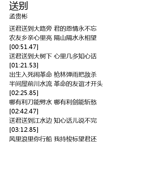 | [00:19.46] | sòng jūn sòng dào dà lù páng jūn de ēn qíng yǒng bù wàng |