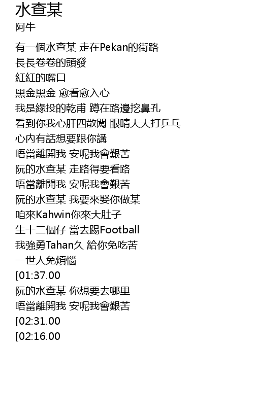 | [02:39.00][02:16.00] | 阮的水查某 走路得要看路 走路得要看路 |