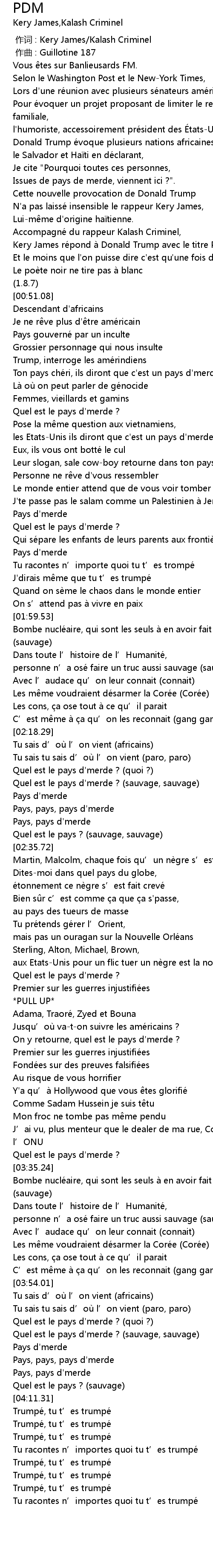 | [00:36.17] | Kery James ré pond à Donald Trump avec le titre PDM. |