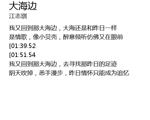 | [00:13.07] | wǒ yòu huí dào nà dà hǎi biān, dà hǎi hái shì hé zuó rì yí yàng |