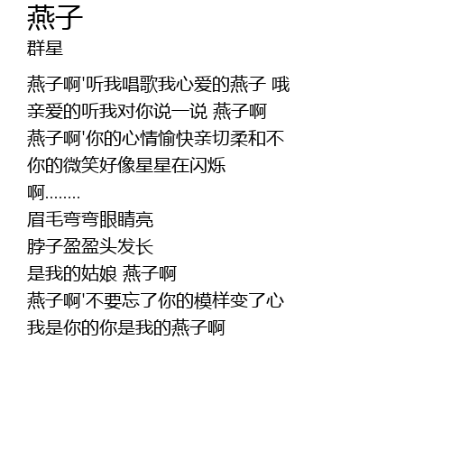| [100:00.00] | 燕子啊'听我唱歌我心爱的燕子 哦 |