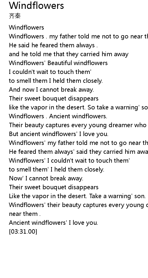 | [03:00.00] | Windflowers' their beauty captures every young dreamer who lingers near them . |