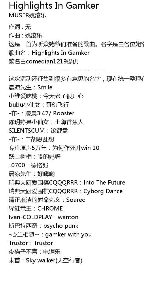 | 这是一首为听众姥爷们准备的歌曲。名字是由各位姥爷们投票选择出来的。感谢大家对我及Gamker的支持。 | |