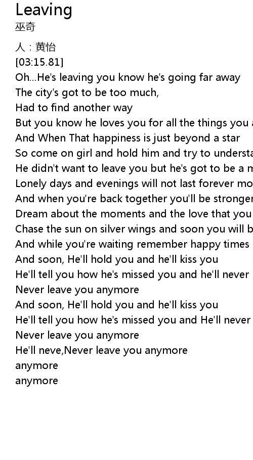 | [00:01.39] | Oh... He' s leaving you know he' s going far away |