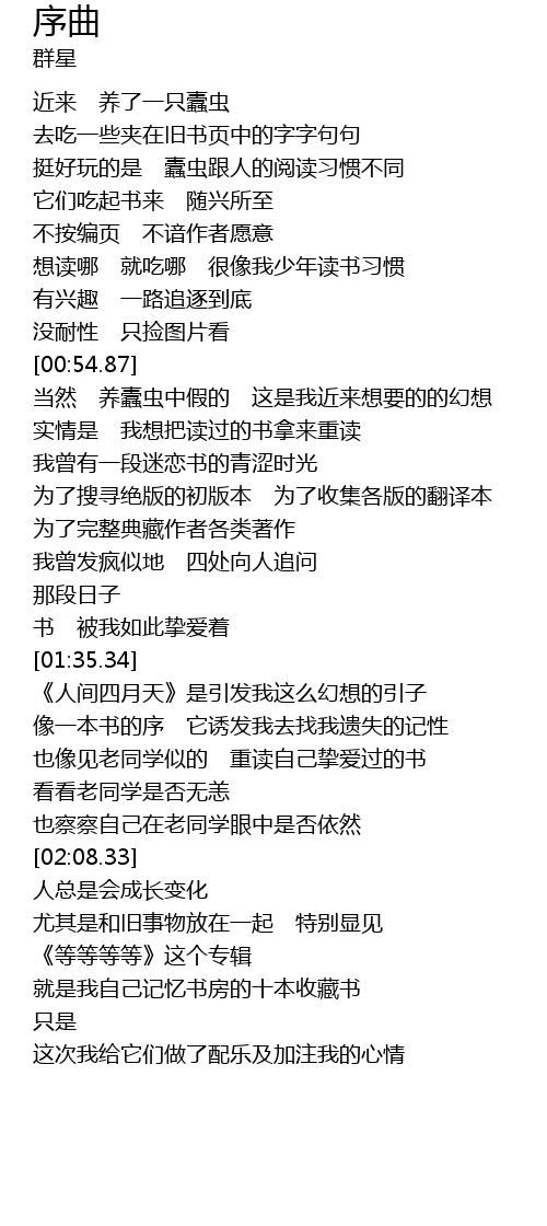 | [01:49.89] | 像一本书的序 它诱发我去找我遗失的记性 |