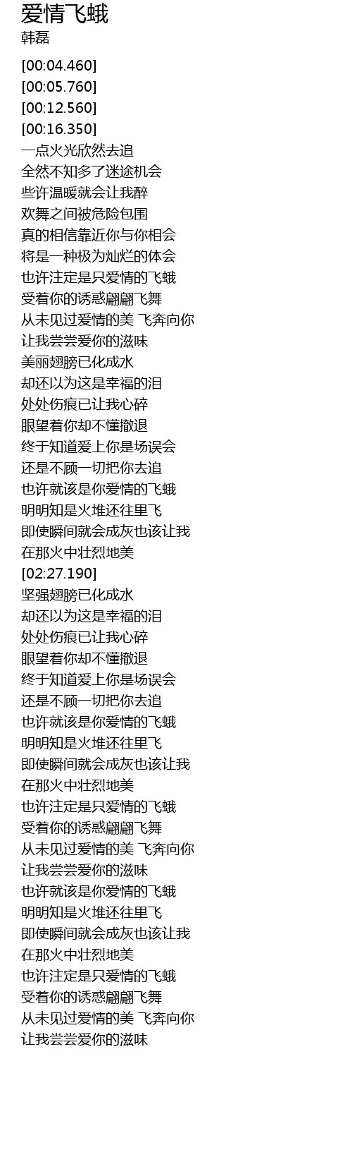 | [04:14.740] | 也许注定是只爱情的飞蛾 |