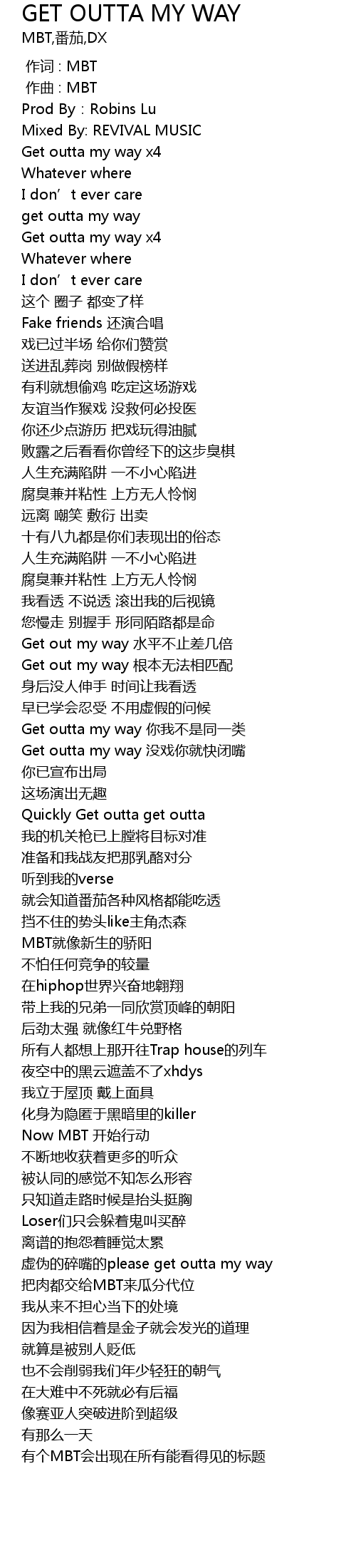 | [01:15.944] | Get outta my way mei xi ni jiu kuai bi zui |