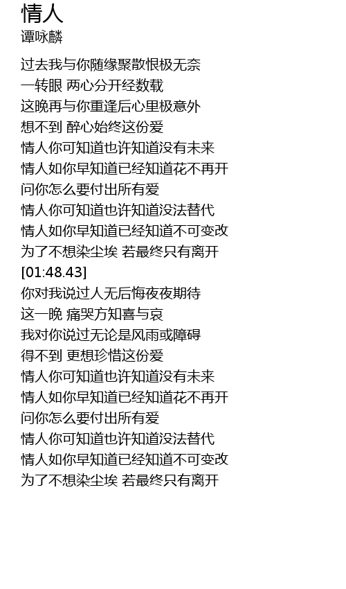 | [01:27.75] | 情人如你早知道已经知道不可变改 |