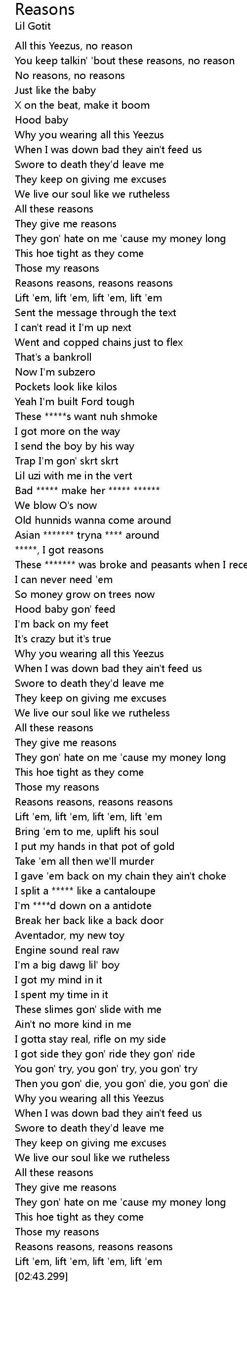 | [01:34.189] | Reasons reasons, reasons reasons |