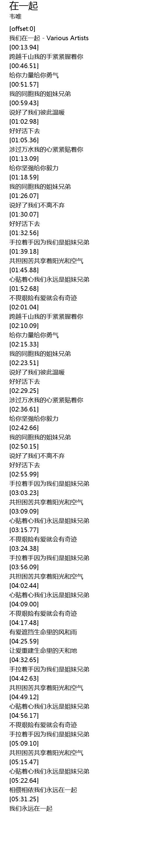 | [00:01.58] | wǒ men zài yì qǐ Various Artists |