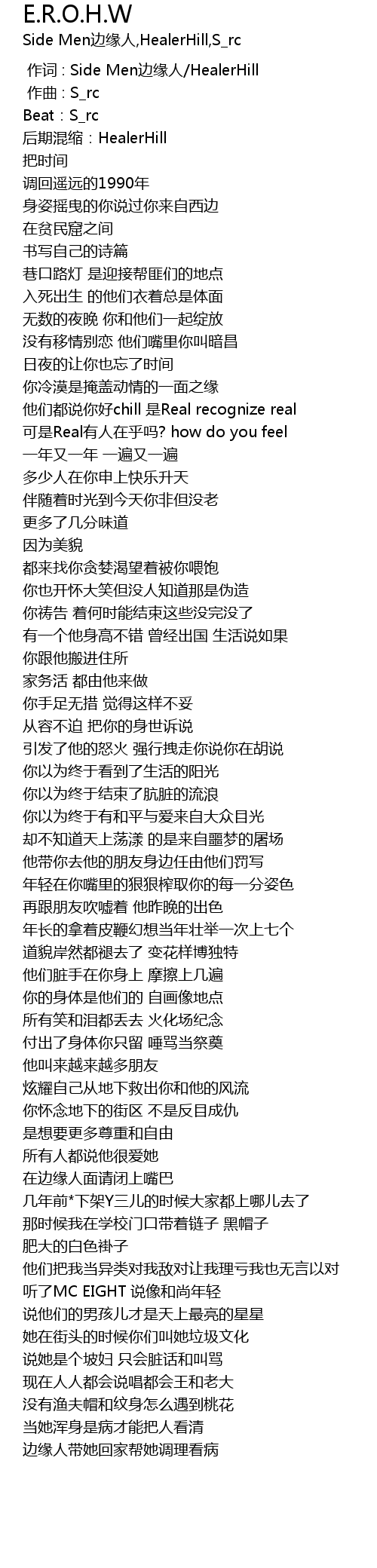 | [00:00.000] | 作词 : Side Men边缘人/HealerHill |