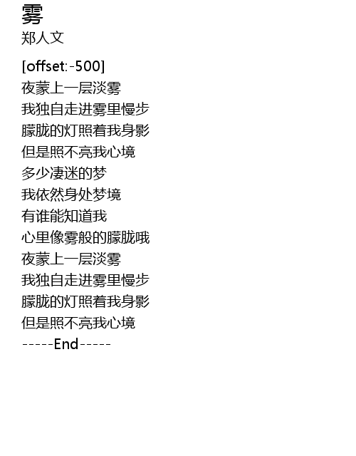 | [01:43.68] | 心里像雾般的朦胧哦 |