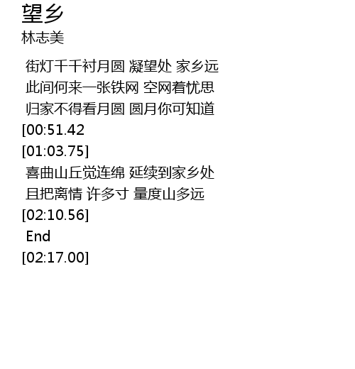 | [00:13.70] | 街灯千千衬月圆 凝望处 家乡远 |
