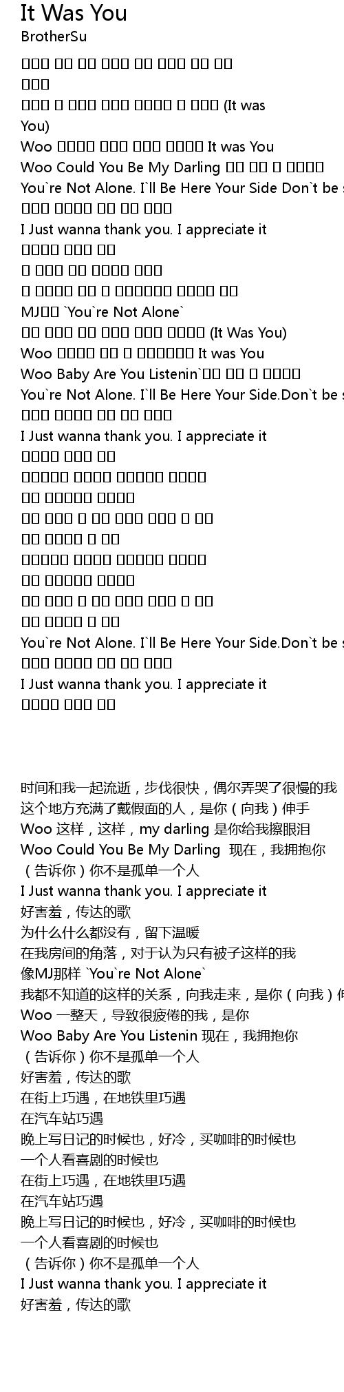 | [00:22.540] | Woo 그렁그렁 매달린 눈물을 닦아준건 It was You |