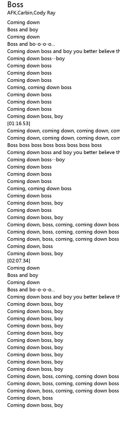 | [02:01.16] | Coming down, boss, coming, coming down boss boy |