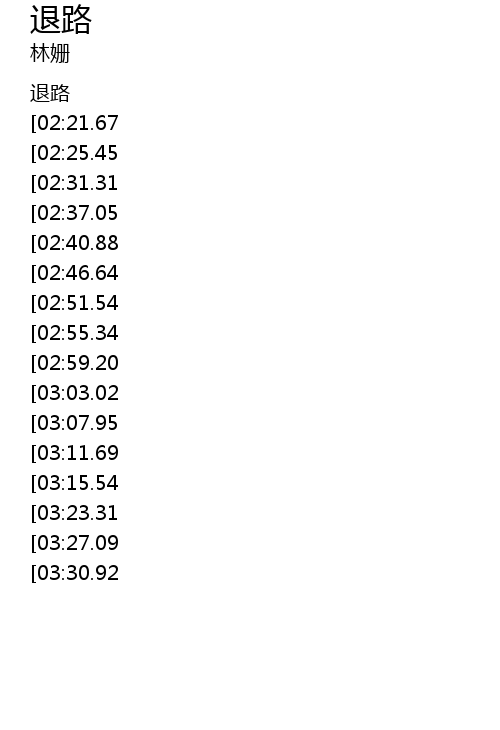 | [01:43.02][03:30.92][04:20.99] | 才了解阮着找退路 |