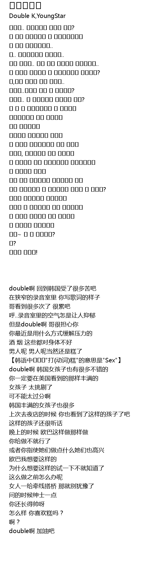 | [00:37.69] | 男人呢 男人呢当然还是糕了 【韩语中떡치다"打(动词)糕"的意思是"Sex"】 |