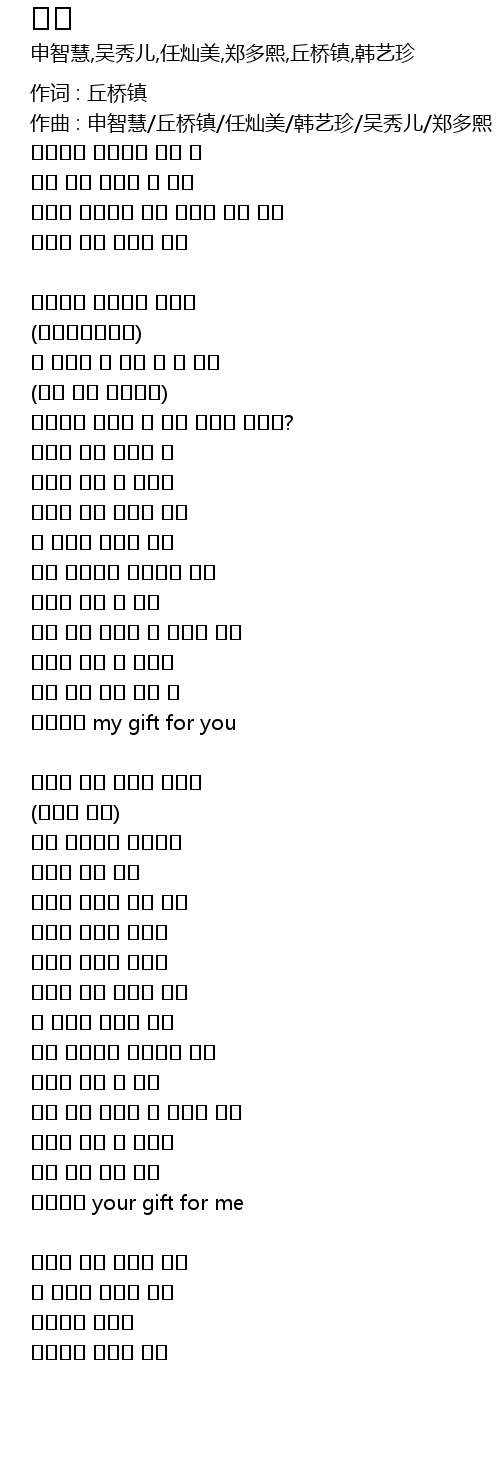 | 作曲 : 申智慧/丘桥镇/任灿美/韩艺珍/吴秀儿/郑多熙 | |