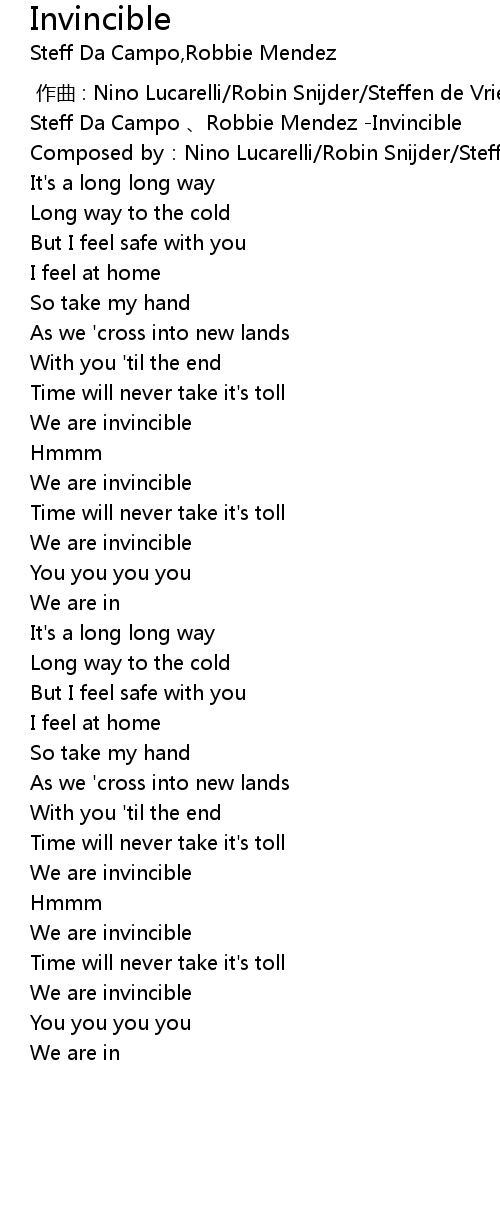 | [00:00.84] | Steff Da Campo 、Robbie Mendez -Invincible |
