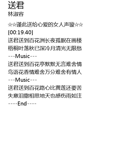 | [00:25.46] | 送君送到百花洲长夜孤眠在画楼 |