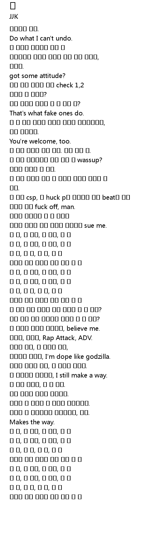 | [00:57.73] | 난 너의 csp, 난 huck p는 아니니깐 밝은 beat만 듣고 싶다면 그냥 fuck off, man. |